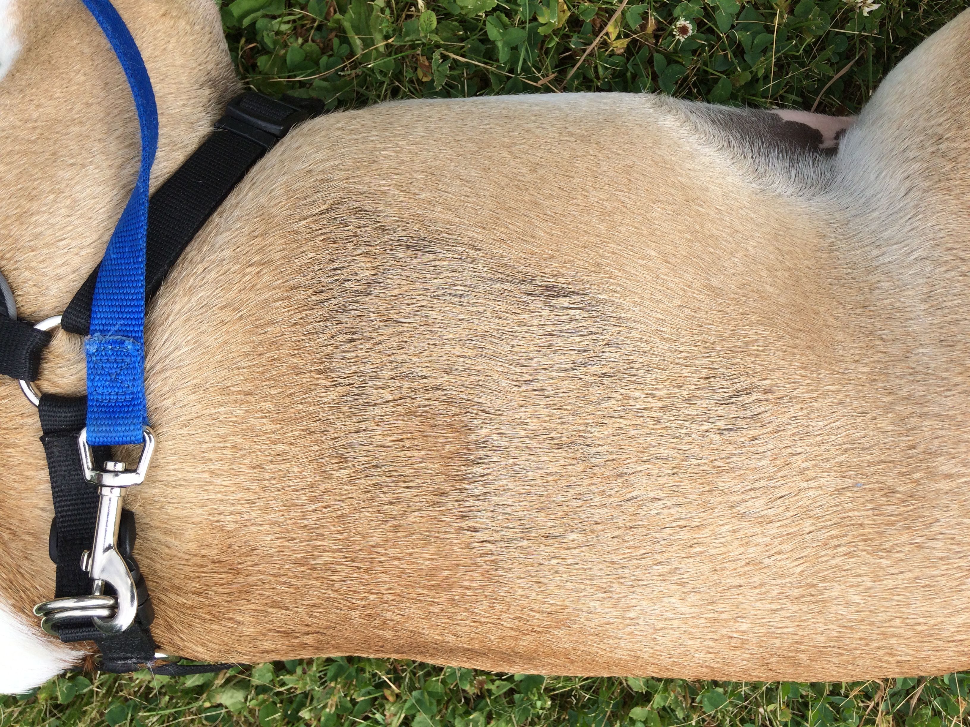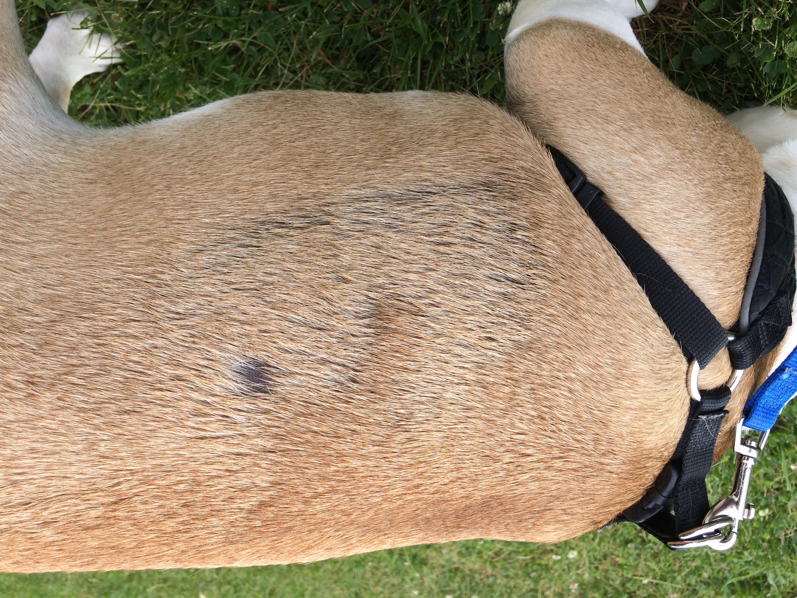 Have you seen any fleas? I don't treat until I see them and we haven't had any in years but we think some came home on my kids clothes. Any who.. I found out very quickly that Biscuit my EB was allergic to them. We treated her right away and the itching stopped but it did leave similar patches like in your picture. Or he could be scratching for another reason like allergies. Good luck and please update on what the vet says.