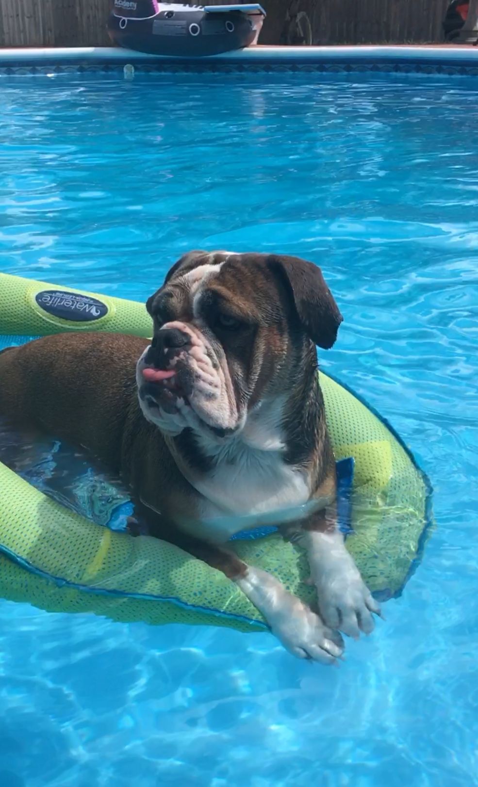 That's one way to stay cool, just be careful as bullies can tire easily and sink like a rock. Most can't swim a lick. Our Lucy fell in the pool once and sank to the bottom. My wife had to jump in and rescue her. Yours seems to do a good job of it, but I would still be careful.