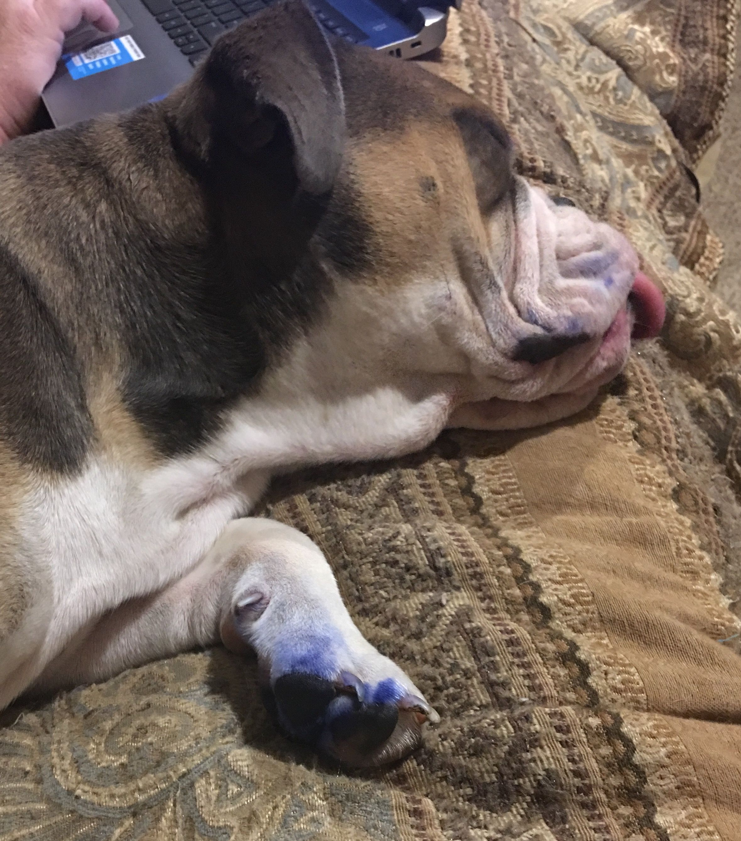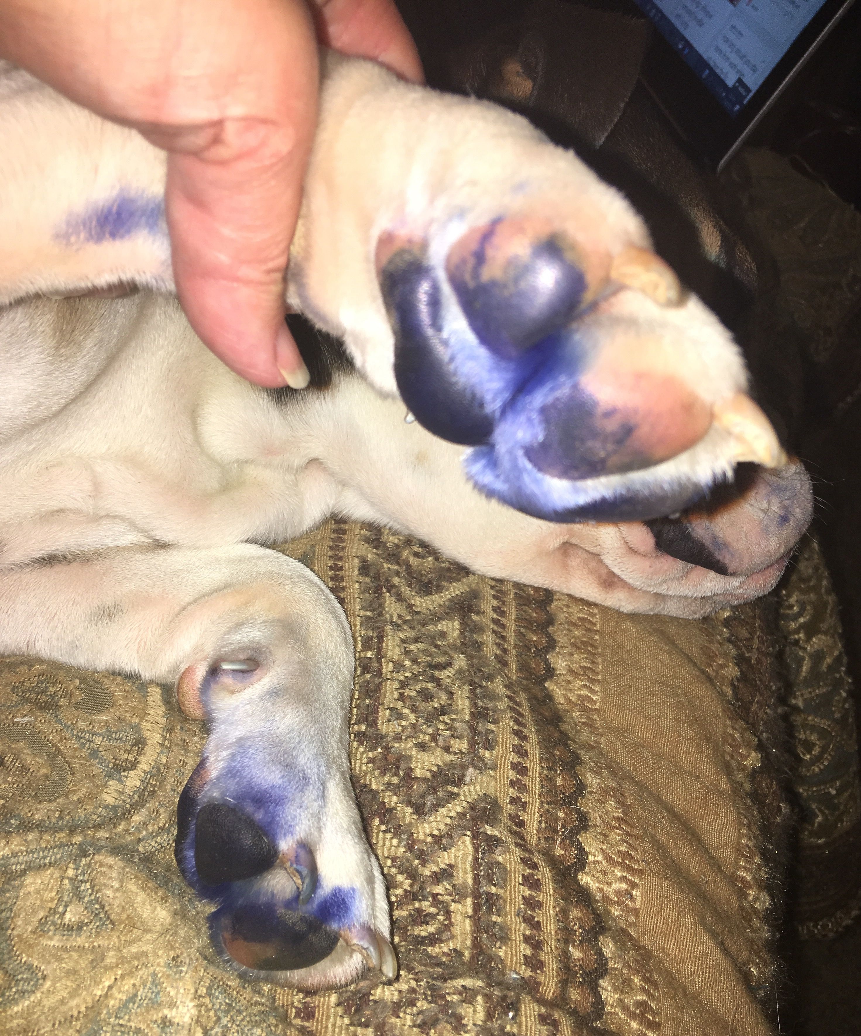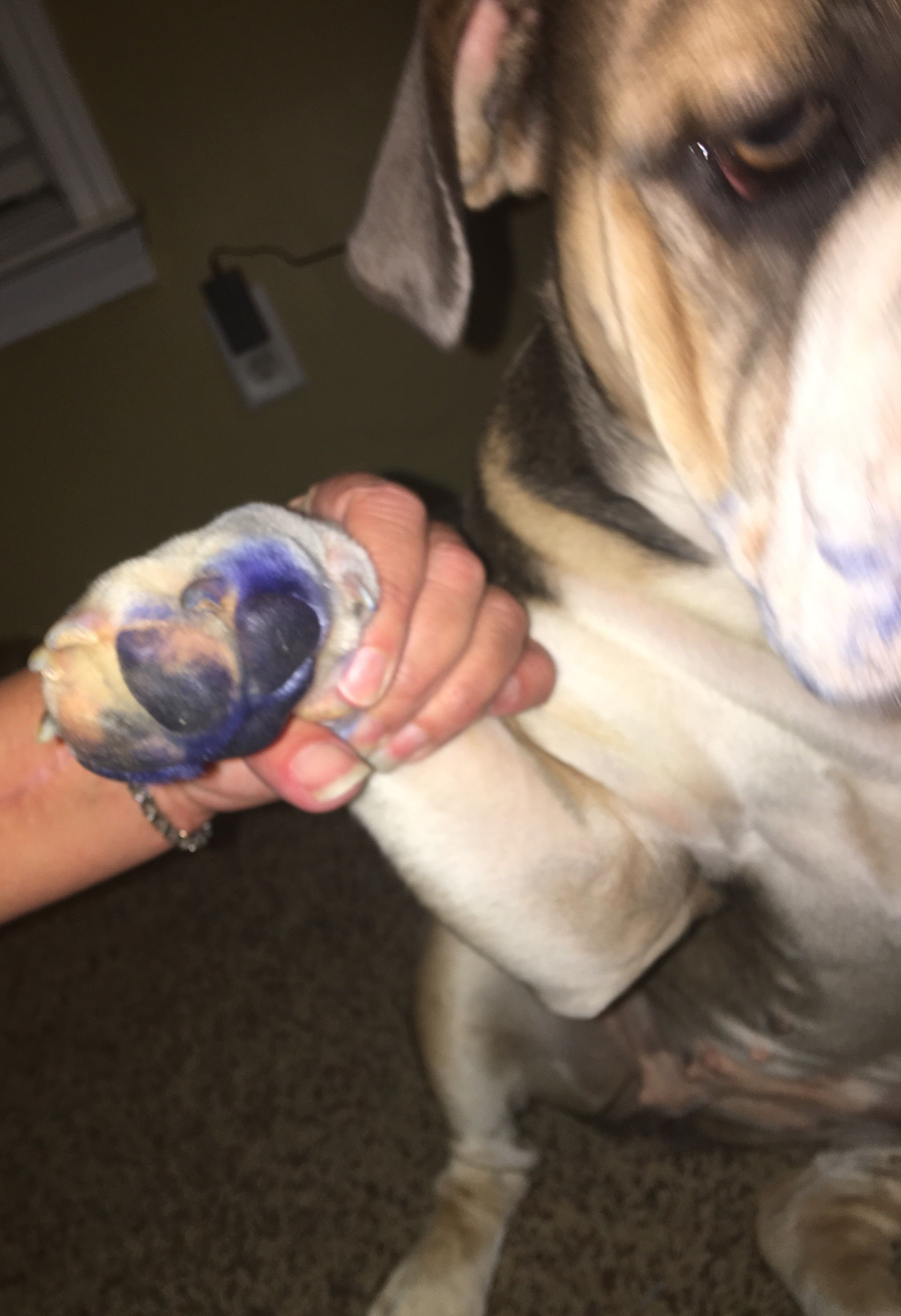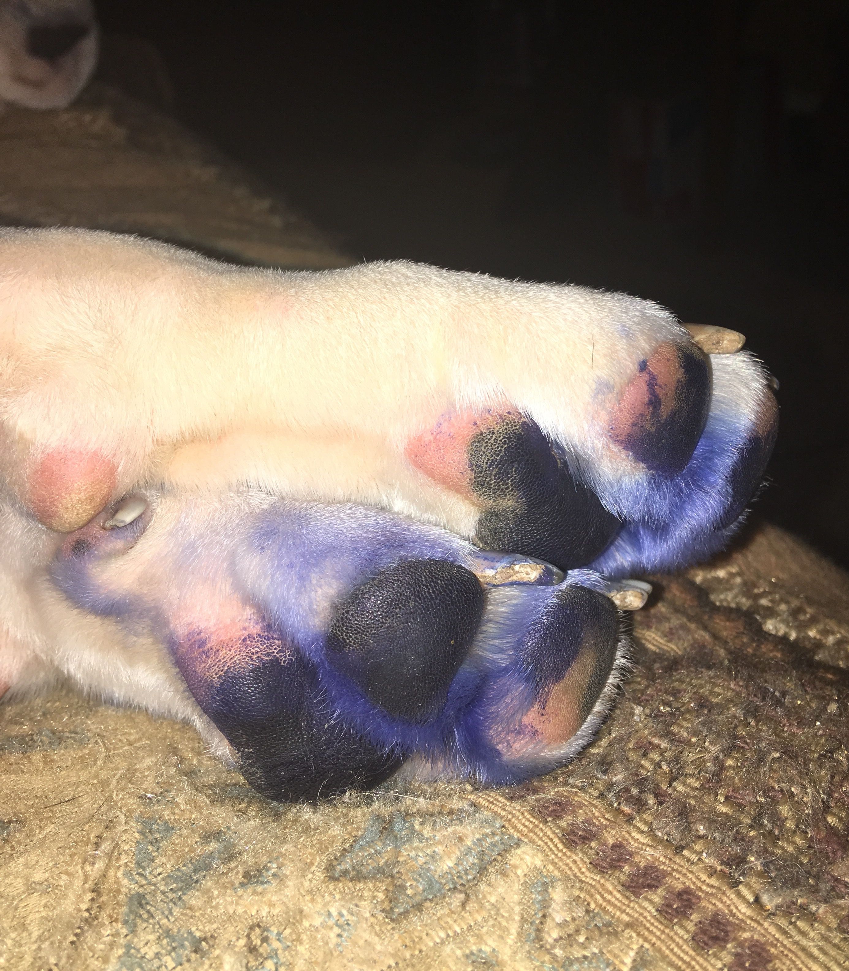Then we noticed all of the BLUE paw prints all over the tile floor.....