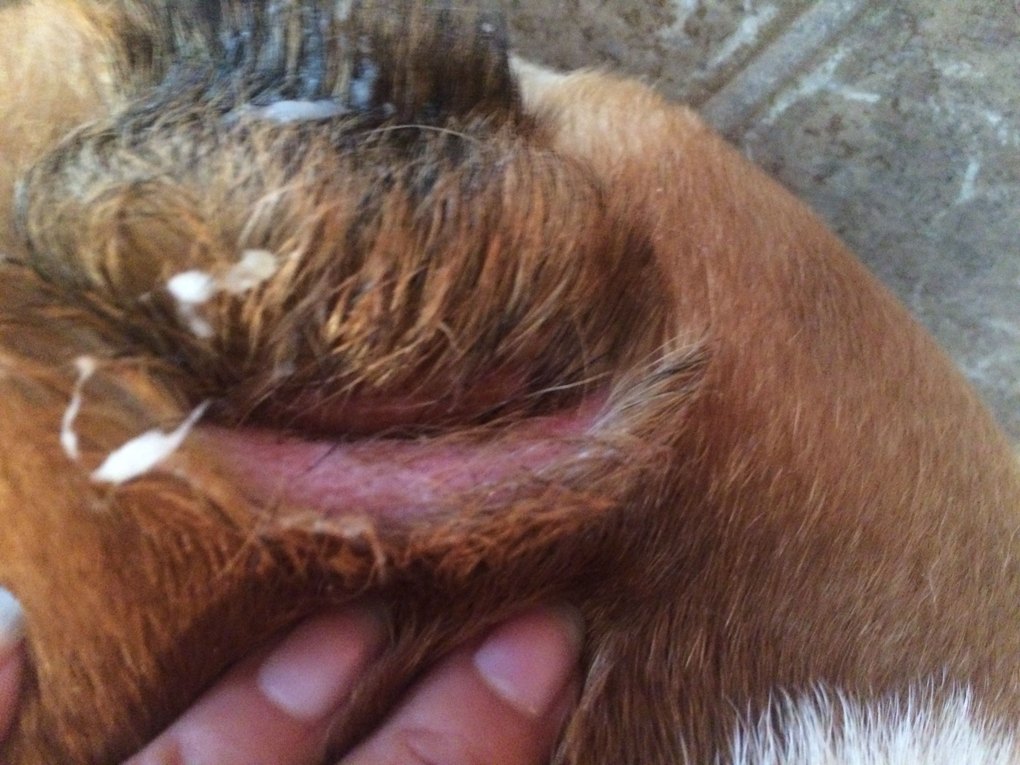 Then he developed a bunch of rash looking areas, under his stomach, and would be armpits and back of thighs (where the legs meet the body) creases. I applied triple antibiotic ointment, and that seemed to help.