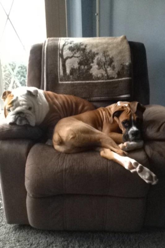 Bullies and Boxers are the best mix EVER!!! Who is that beautiful senior sitting in the middle?!! Looks like mom is going to have to get a bigger couch… Lol