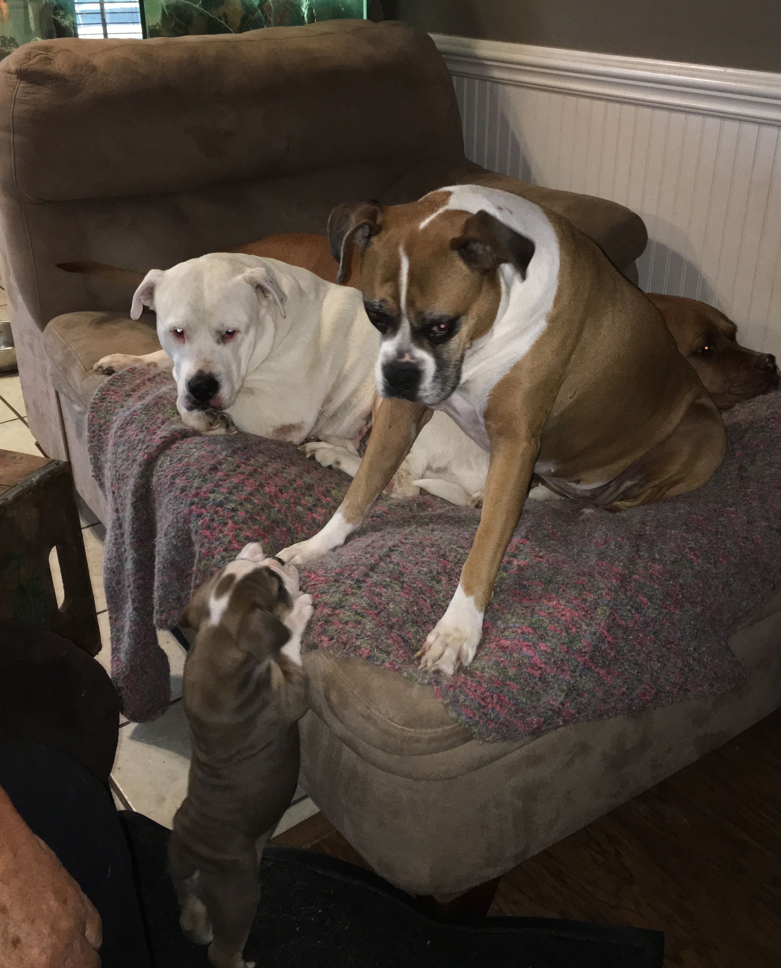 - Bella (EBD) Roxy (pit mix) Tyson (pit mix) Sadie (boxer)
