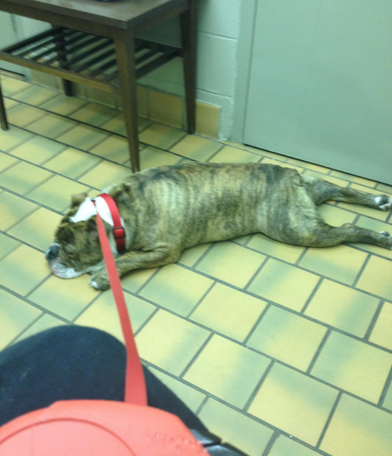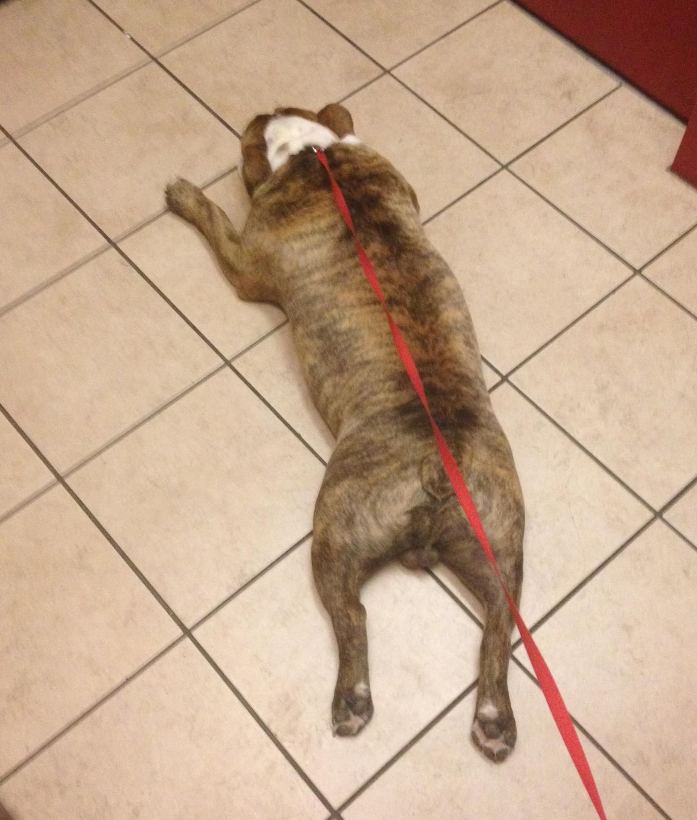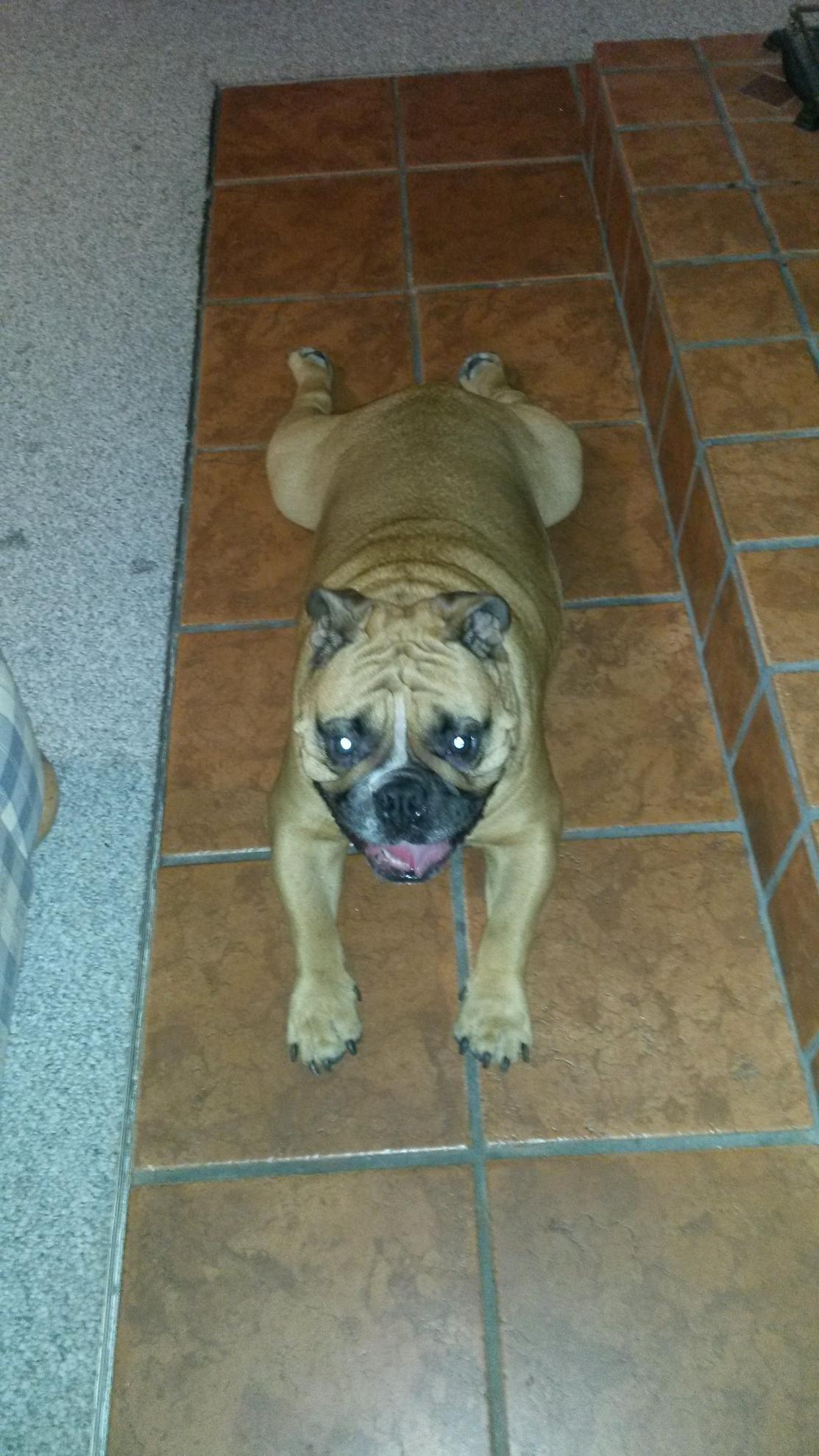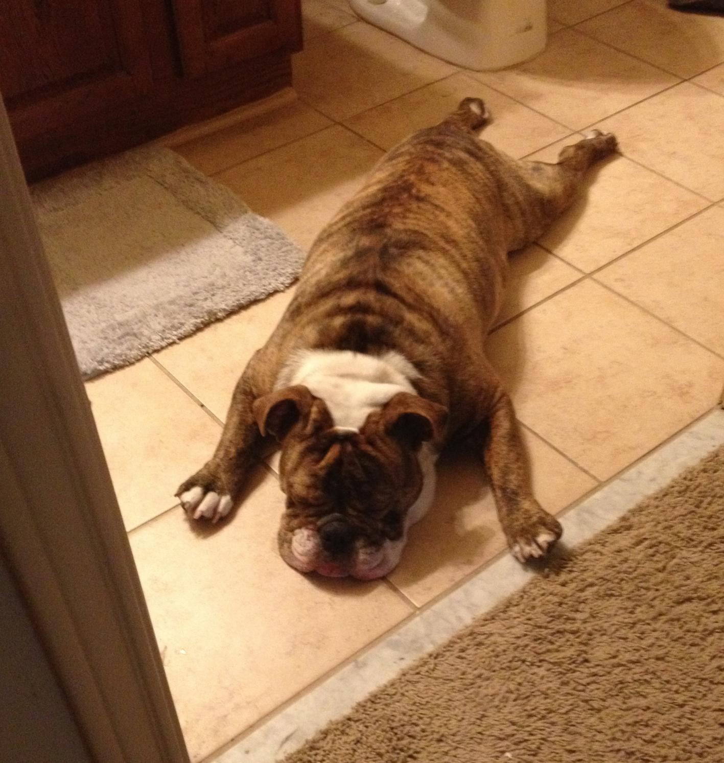George loves a tile floor. This is his go-to position on ANY tile floor and as soon as he realizes the floor is tile he plops. Anyone else have a hippofroggybully that does this??