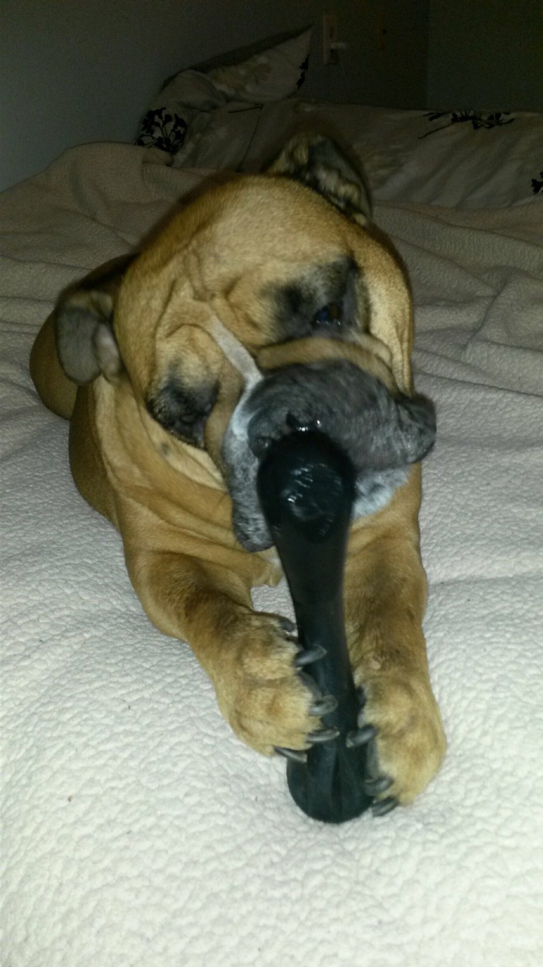 I have posted about this topic before but here it is again. Goob LOVES to chew his bone all day long. Not a problem. It is his favorite toy.