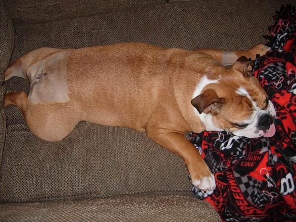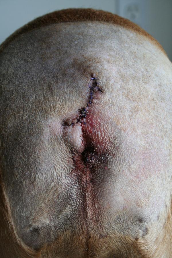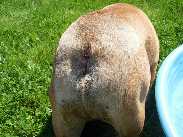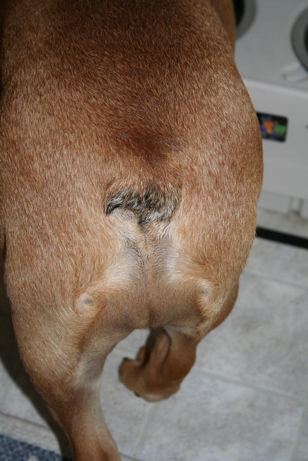 Firstly, Bruisers tail pocket is not, and never has been infected. Everyone who's had this done has said their bulldog was suffering from constant infections. Bruisers tail pocket is so clean - no odours or redness or discharge or mess. We had always been aware of tail pockets in Bulldogs before we got one and we clean it and dry it daily. The only thing we get come off it is lots of hair, which makes me think that it is making him really itchy. Despite no infections I have to re-emphasise it is VERY tight, and obviously causing him a lot of discomfort.