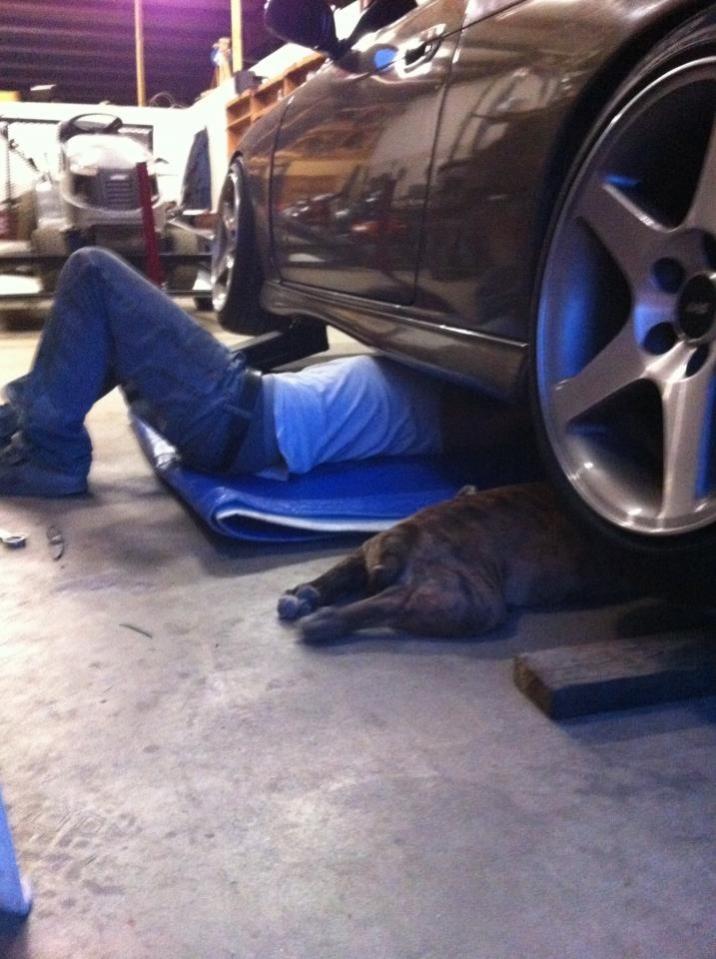 he LOVES laying under the car with his daddy. Whatever he's doing Tank is right there with him.