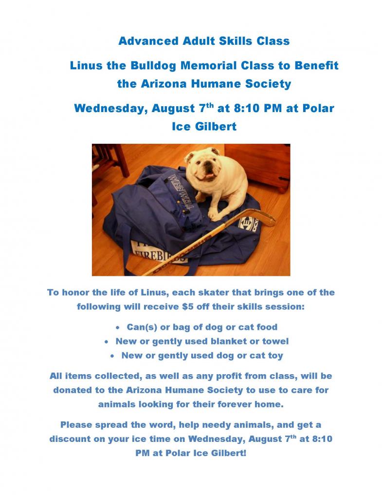 Some of you may know that my husband and I are avid ice hockey players and run a weekly adult hockey skills class in our area. As a tribute to Linus, I decided to organize a skate that offers a discount to any skater that brings us food, blankets, towels, and toys to class AND we will be donating all profits as well to the Arizona Humane Society.