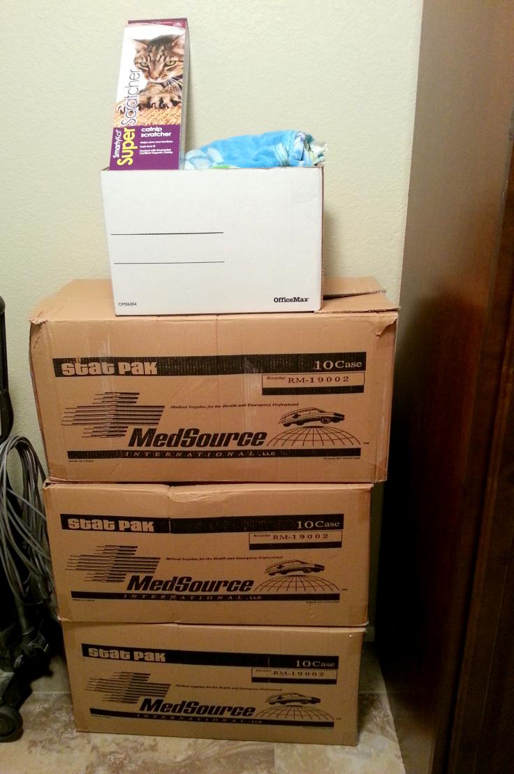 We collected three boxes of medical blankets from a skater who is an EMT and his work donated them. We got another full box of kitty and dog toys, blankets, food, and other goodies - not to mention the stuff I need to dig out from my own stash before we go make the donation.