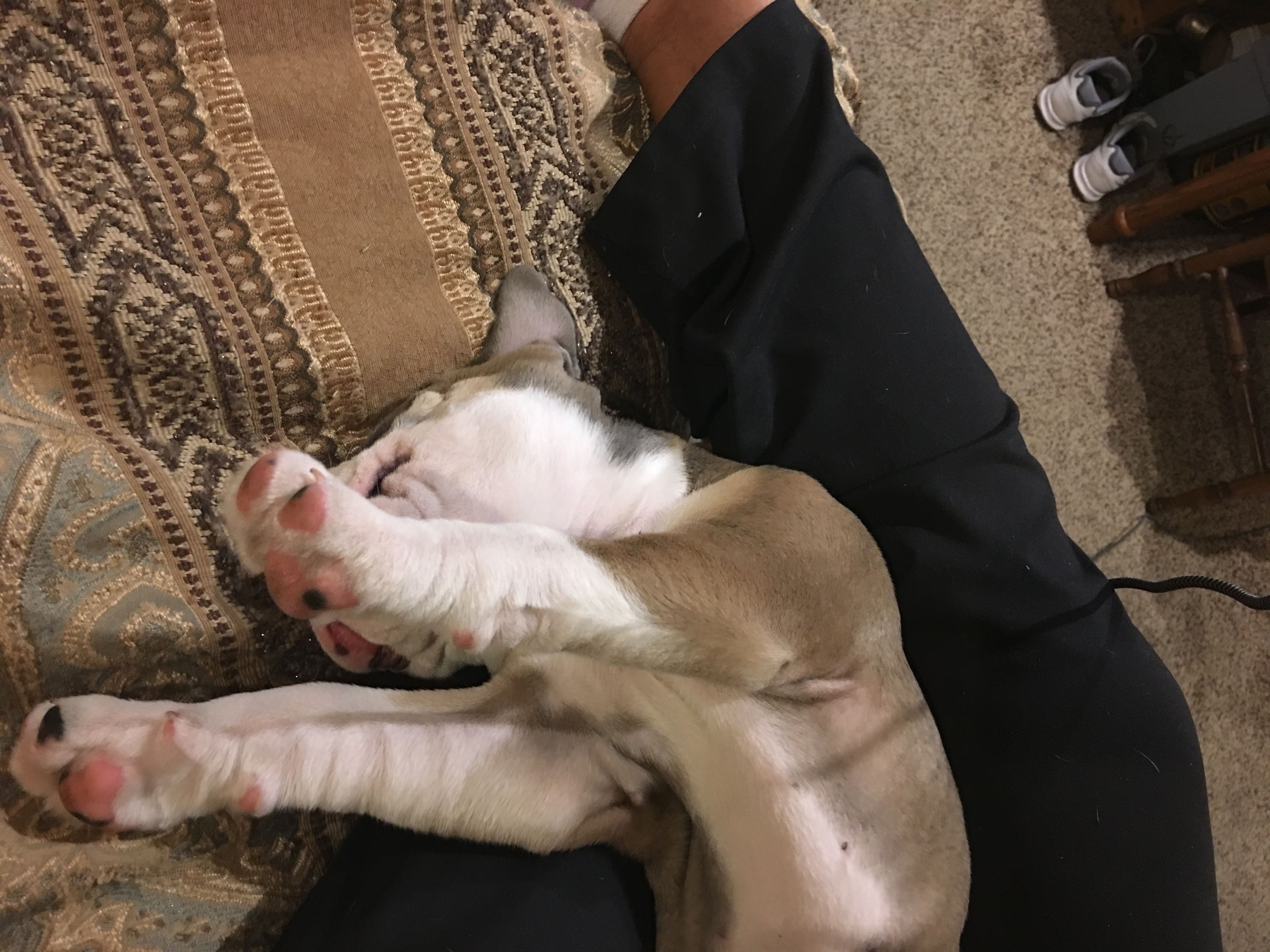 Mine was sleeping on the couch. Husband and I were there watching movies. We missed the photo op, Canelo's head hanging off the couch sleeping hard, he slid off the couch in a headstand position for less than 5 seconds, still sleeping and his body fell over parallel to the couch. He still didn't wake, took him about a minute, lollll!!!! He still does awkward positions but that was his best.
