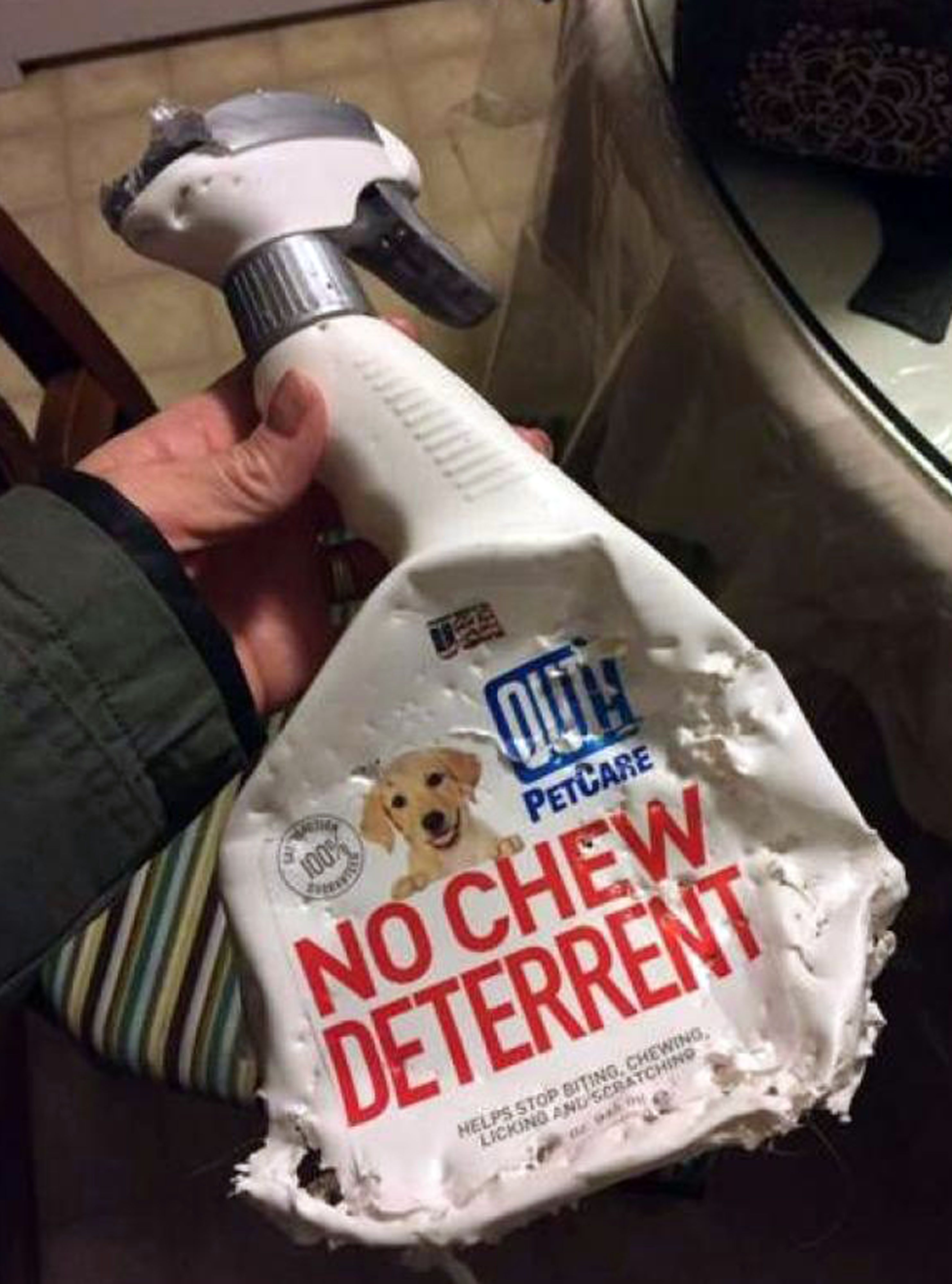 No Chew Deterrent? So it's supposed to deter from 'not chewing"? Sometimes a single word can undermine an otherwise brilliant marketing scheme...providing the dog can read. Obviously this canine is a well-versed reader.