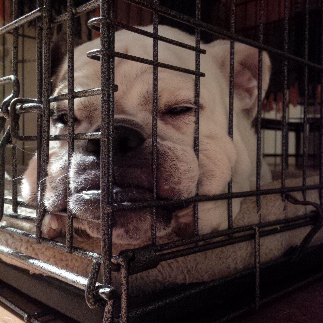 Last night... #IzzyBear squishing her face against the crate after a busy day at day care!