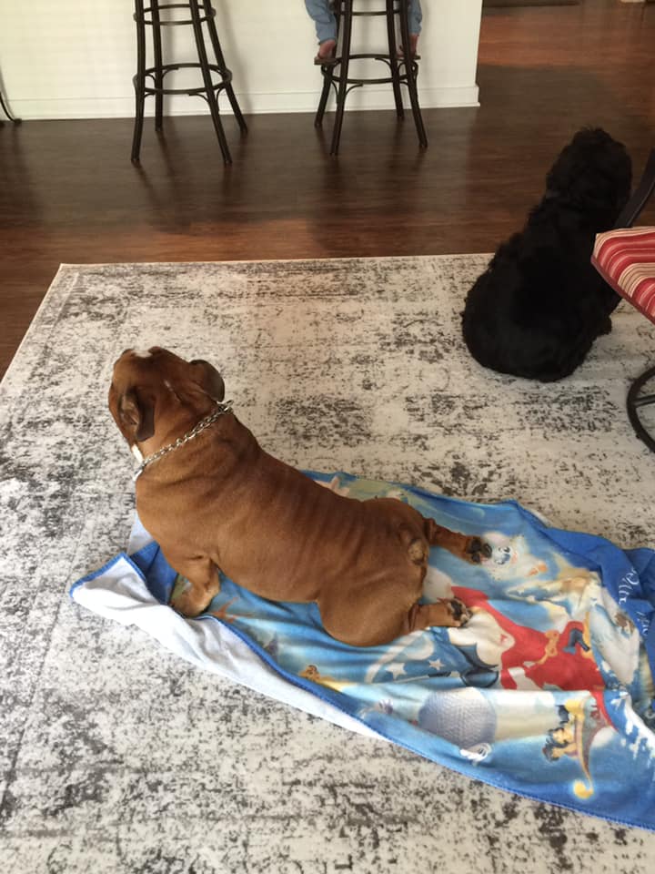 Here is my bullyboy Gabe doing Yoga this morning on his favorite towel.