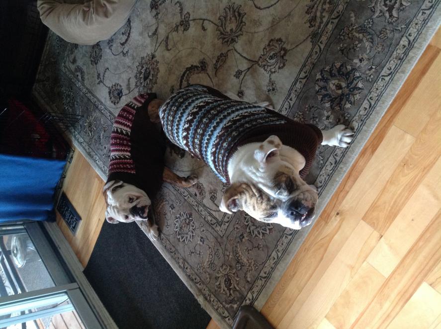 I'm new to the Northern CA area and while doing some research I found out it gets to about 51 degrees sometimes from November til who knows when!! Well we live in apartments and Stoagie will have to be walked to go potty and to burn energy, so I don't want him getting chilly even if we're just out for about 10-15 minutes. Any clothes suggestions???? I've never dressed a dog but he's my baby and I want him comfortable. Sweaters? Jackets? Maybe something for his feet? And if so where do I go? Online??